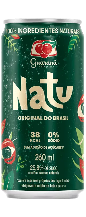 Natu é feito com ingredientes 100% naturais, sem conservantes e corantes artificiais, 0% de sódio e nenhuma adição de açúcares ou adoçantes. Tudo isso sem perder o sabor de Guaraná Antarctica que você já ama.